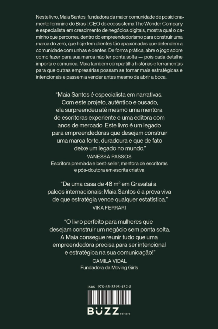 Neste livro, Maia Santos, fundadora da maior comunidade de posicionamento feminino do Brasil, CEO do ecossistema The Wonder Company e especialista em crescimento de negócios digitais, mostra qual o caminho que percorreu dentro do empreendedorismo para construir uma marca do zero, que hoje tem clientes tão apaixonadas que defendem a comunidade com unhas e dentes. De forma prática, abre o jogo sobre como fazer para sua marca não ter ponta solta — pois cada detalhe importa e comunica. Maia também compartilha histórias e ferramentas para que outras empresárias possam se tornar mais estratégicas e intencionais e passem a vender antes mesmo de abrir a boca.